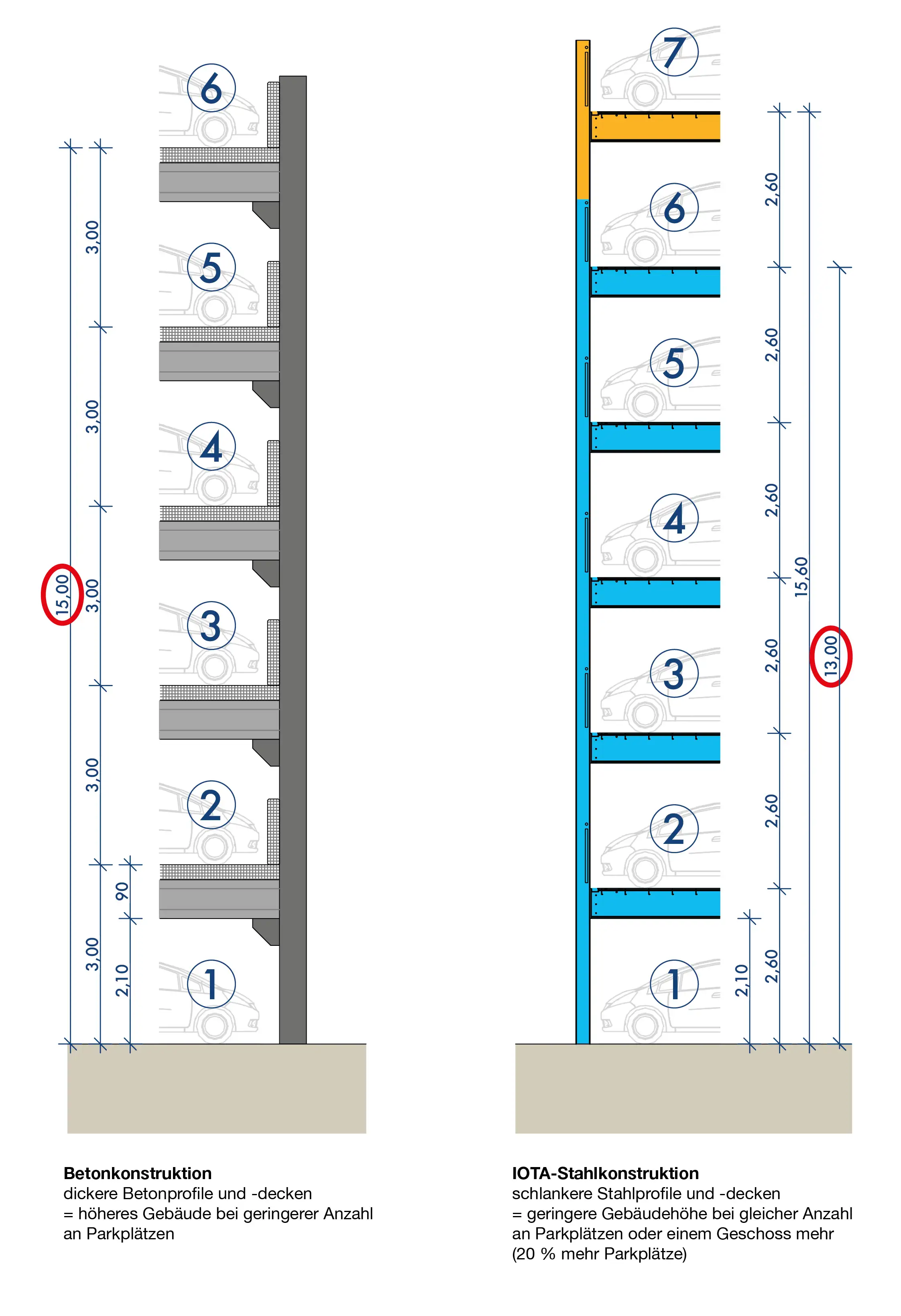 Mit unserer modernen Stahlbauweise und unserem speziellen IOTA-Deckensystem reduzieren wir die CO2-Emissionen bei der Errichtung des Parkhauses um mehr als 600 %* im Vergleich zur herkömmlichen Betonbauweise. Mehr dazu finden Sie unter der Rubrik Nachhaltigkeit